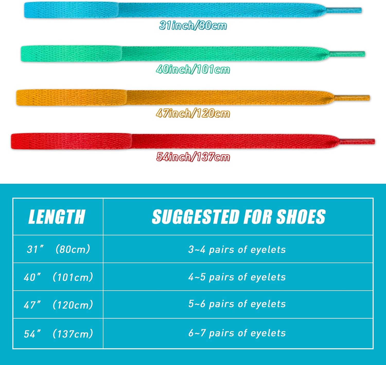 We know that length matters more than most people think when replacing laces. The included sizes—31″, 40″, 47″, and 54″—cover the typical range from low-top sneakers to high boots. Below we break down which length commonly matches which shoe type and recommended eyelet counts to help us choose the right pair fast.